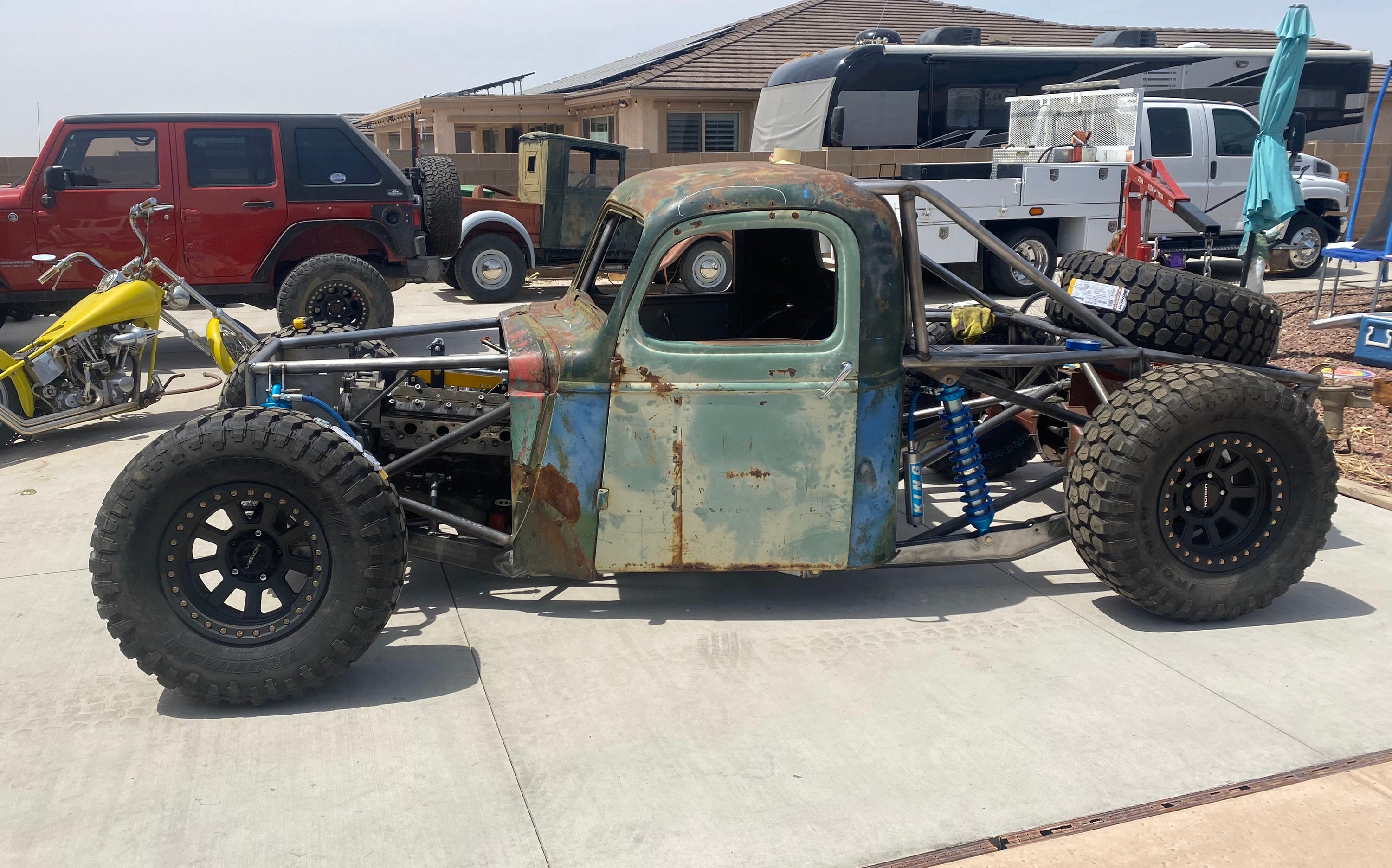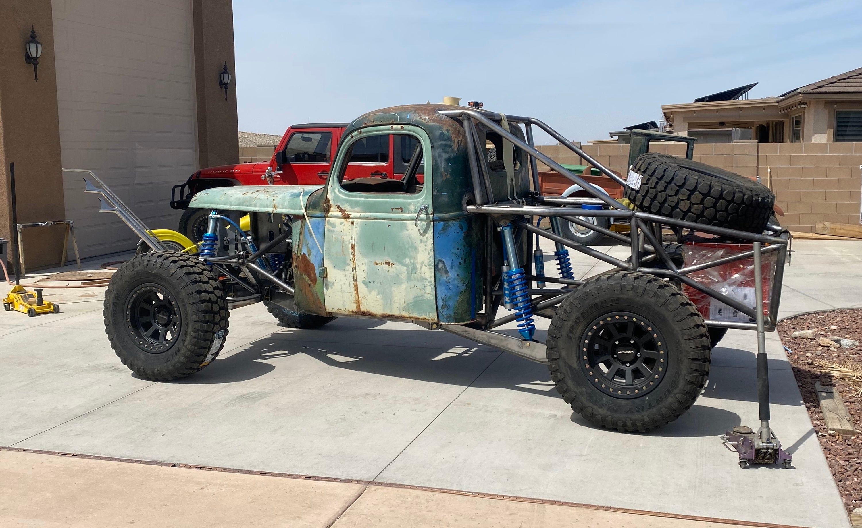 His current project is a dentside F100 truck, with long travel beams, currently prototyping LS motor mounts.